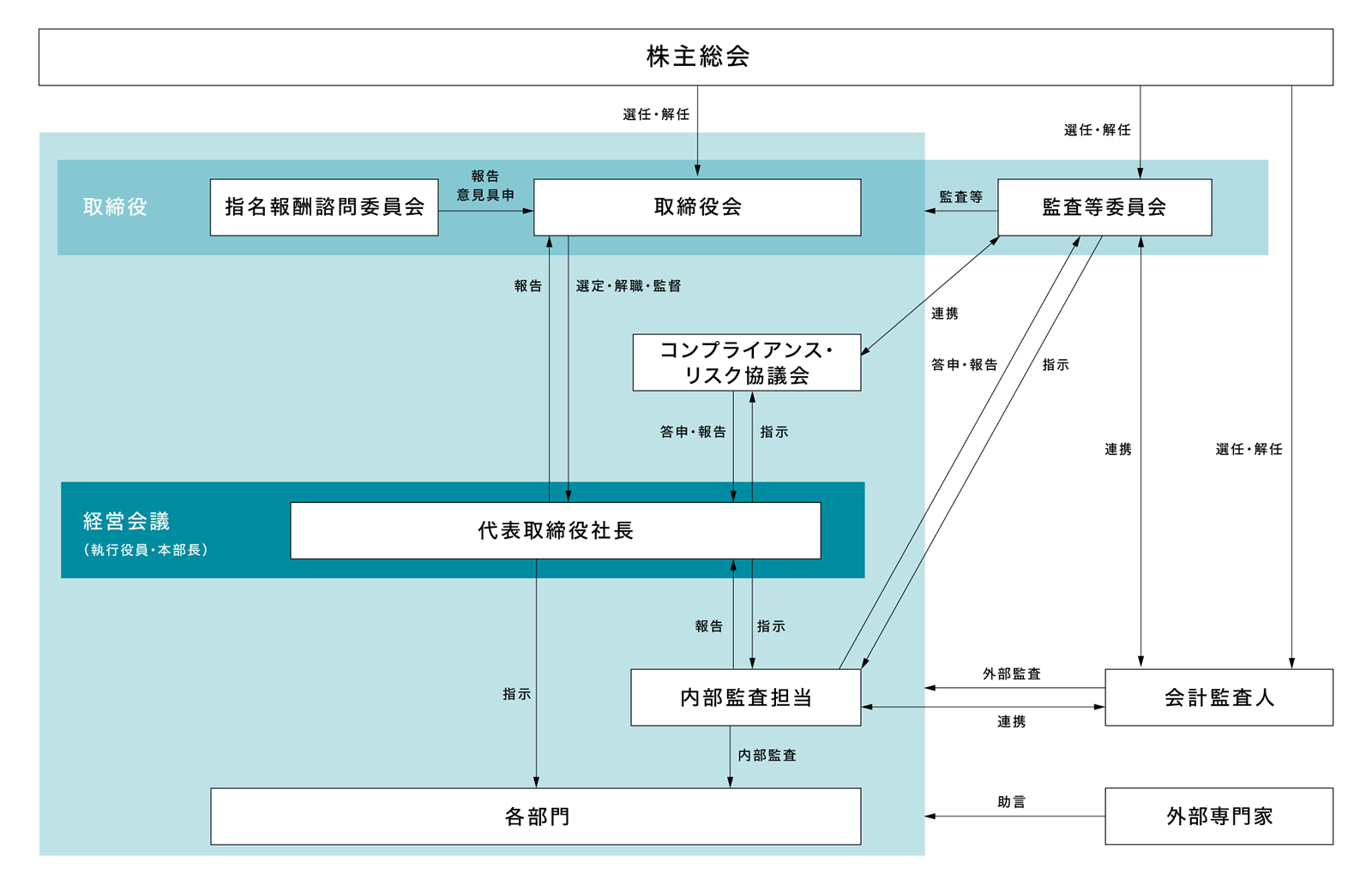 当社は、経営の重要な意思決定及び業務執行の監督を行う取締役会の経営機能及び監督機能の一層の強化、並びに業務執行の機動性・効率性の更なる向上を図るために、2023年1月より監査等委員会設置会社に移行しました。社外取締役が過半数を占める監査等委員会が、内部統制部門等と緊密に連携し、中立・独立の立場から、取締役会による意思決定が適切かつ効率的に行われていることを監督しています。